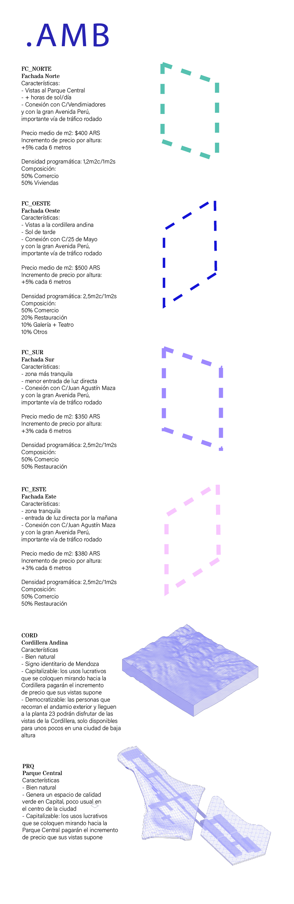 La complejidad del volumen de la parcela obliga a jerarquizar, entender qué supone cada orientación (en base a la trayectoria solar, a las calles que conecta, a la posibilidad de vistas a la cordillera, a la altura a la que se encuentra, el viento que sopla etc.) Todo es susceptible de catalogarse.