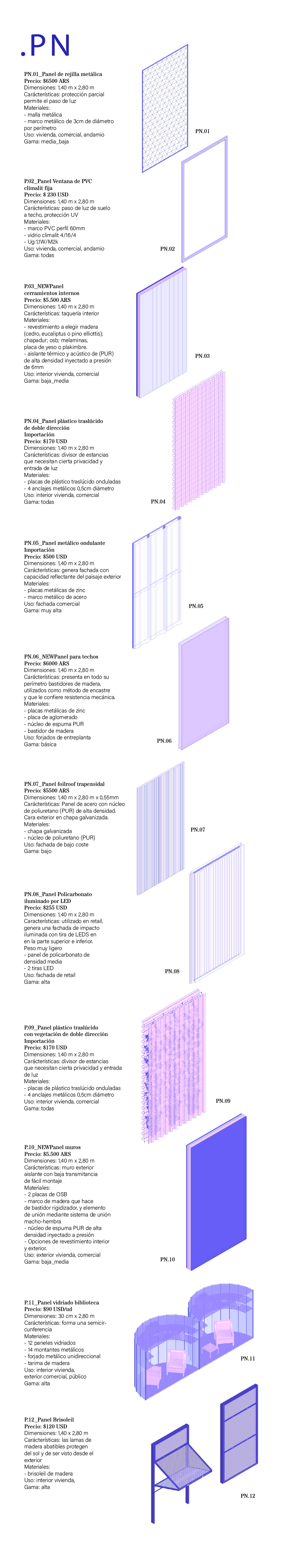 Este proyecto se obsesionó con la idea de catalogar. Catalogar supone extraer las características fundamentales de todos los elementos que conforman un proyecto, desde los detalles más básicos (dimenisión, coste, material), a los más subjetivos (qué caché me proporciona este material, qué grado de privacidad busco en mi vivienda/negocio).